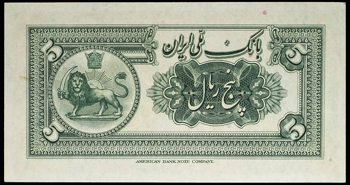 - 5 rials avec le portrait de Reza Shah Pahlavi ND (1933 / SH 1312).
