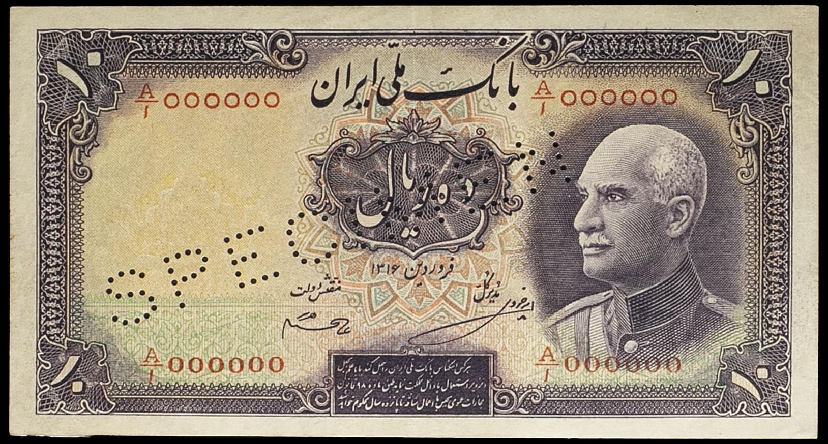 - 10 rials avec le portrait de Reza Shah Pahlavi (SPÉCIMEN) SH 1316 (1937).