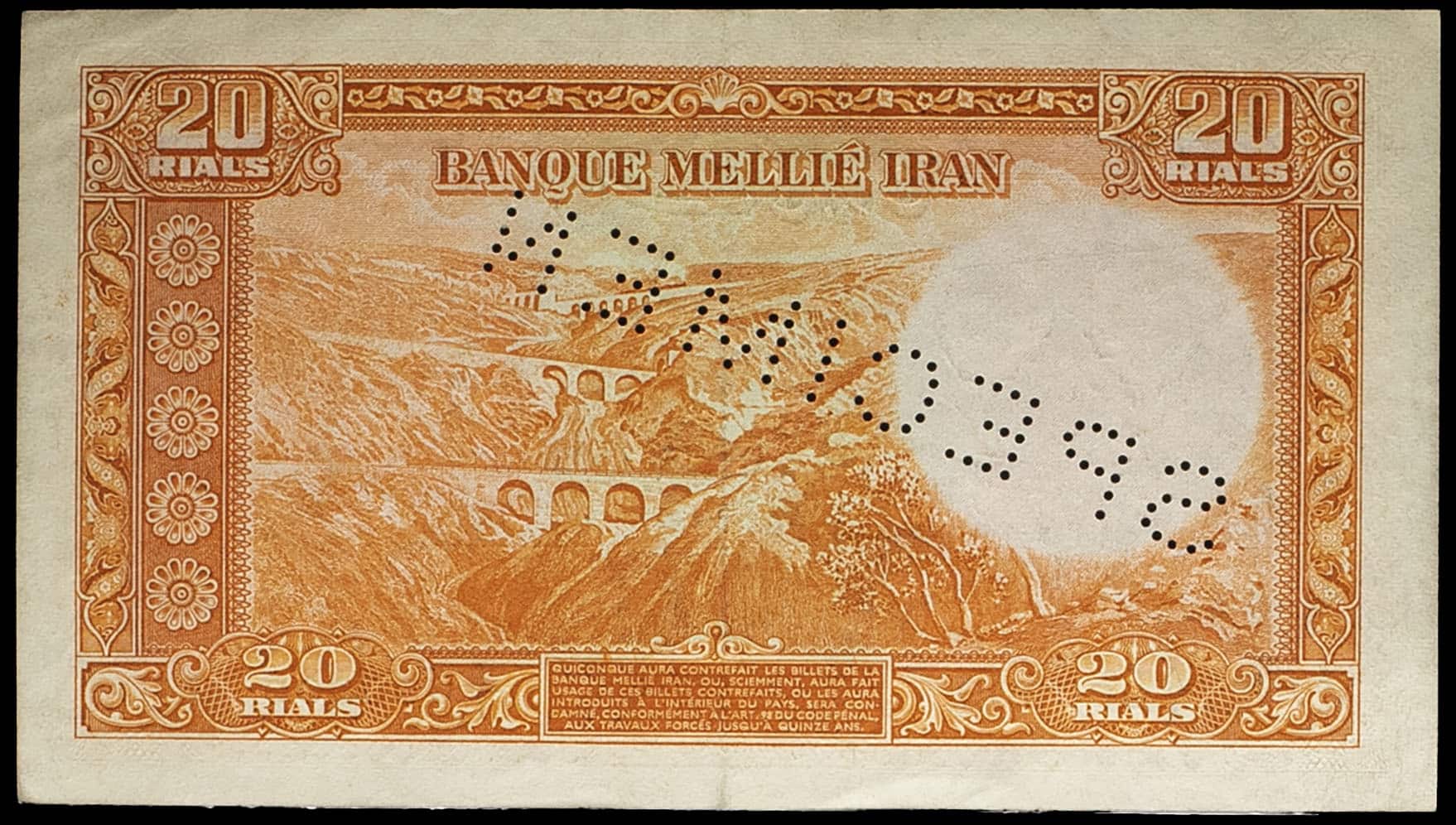 - 20 rials avec le portrait de Reza Shah Pahlavi (SPÉCIMEN) SH 1316 (1937).