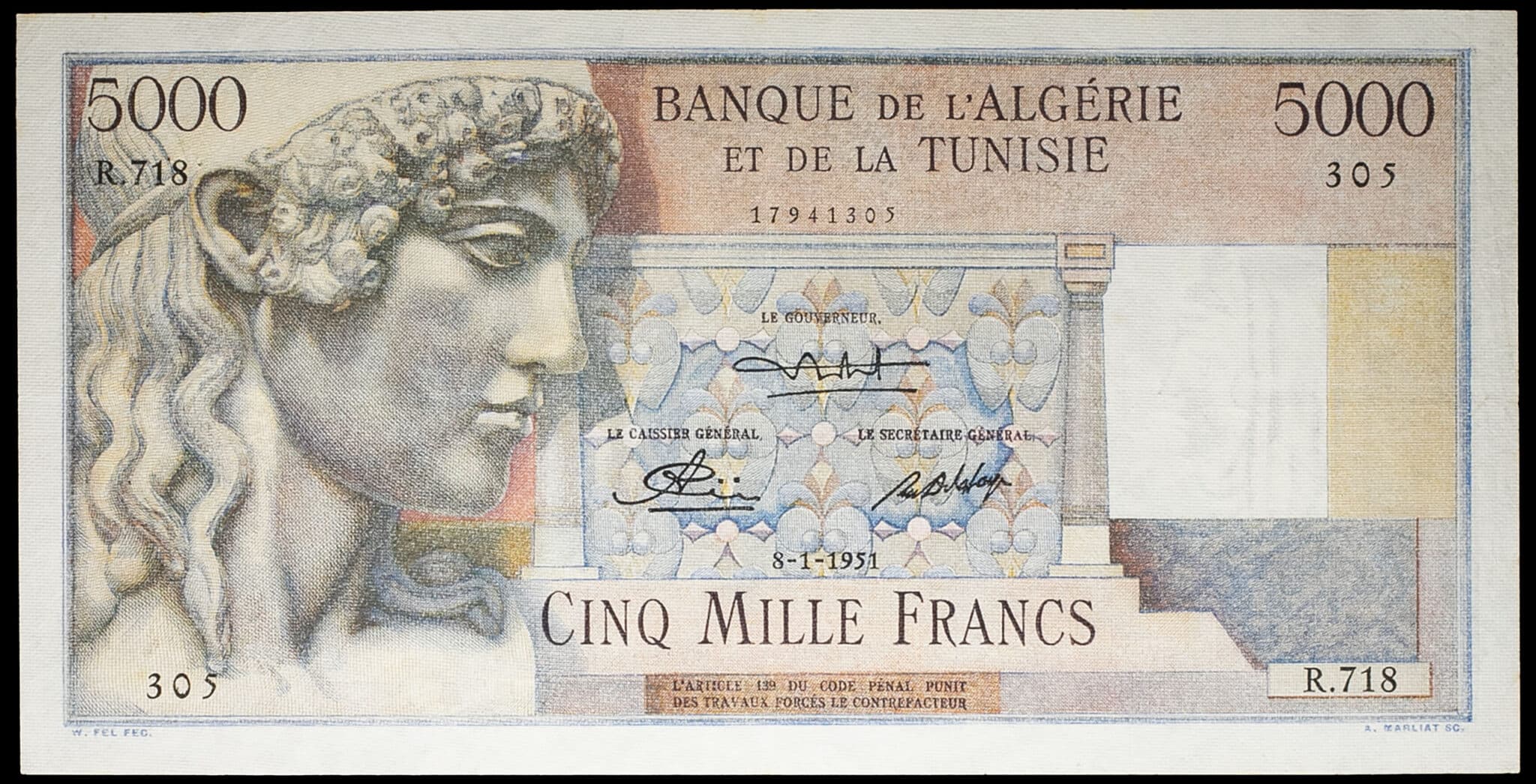 - ALGERIA 5000 francs type “Apollon” modifié 8-1-1951.