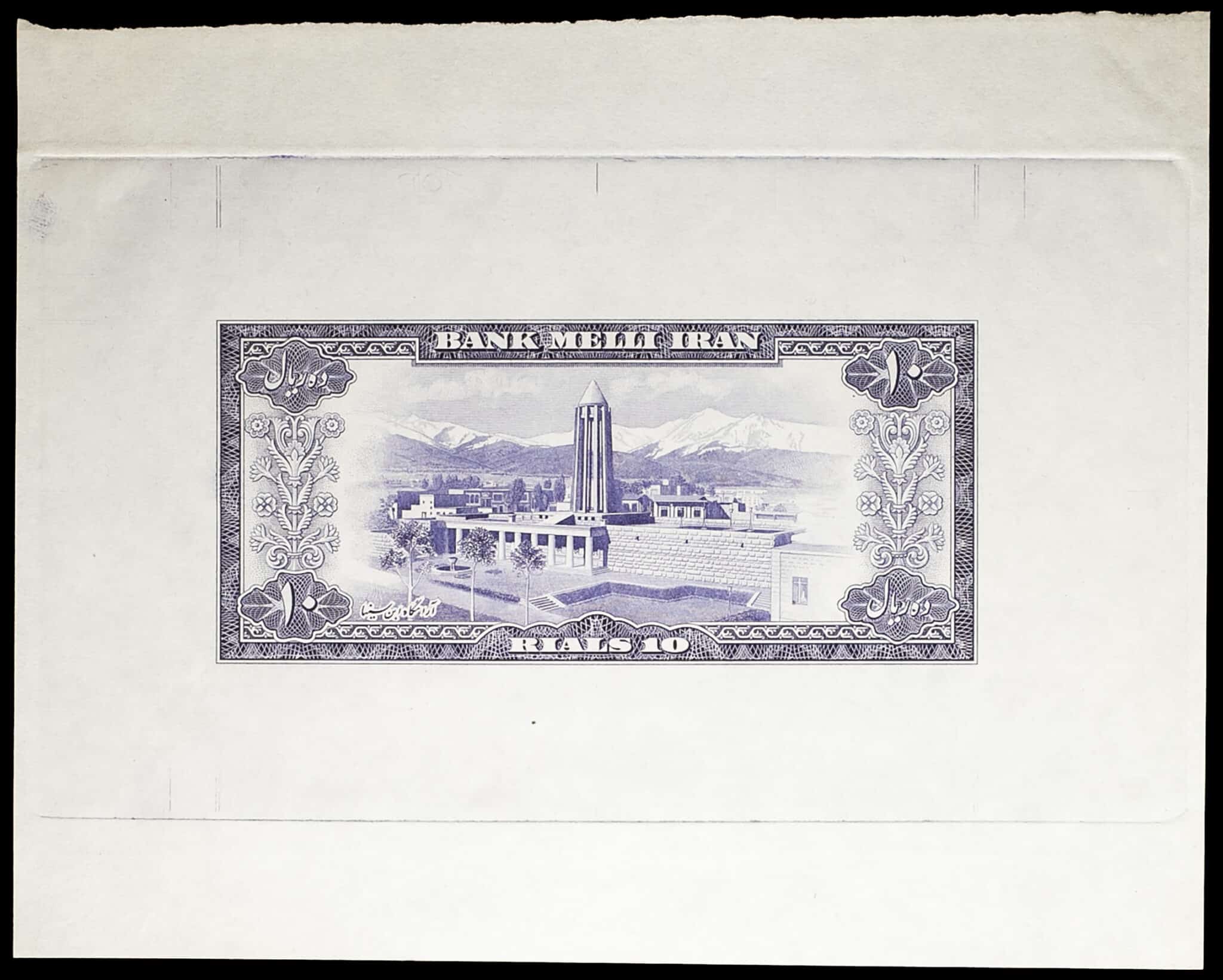 - Épreuve de verso de 10 rials (BACK PROOF) avec grandes marges ND (1954 / SH 1333).
