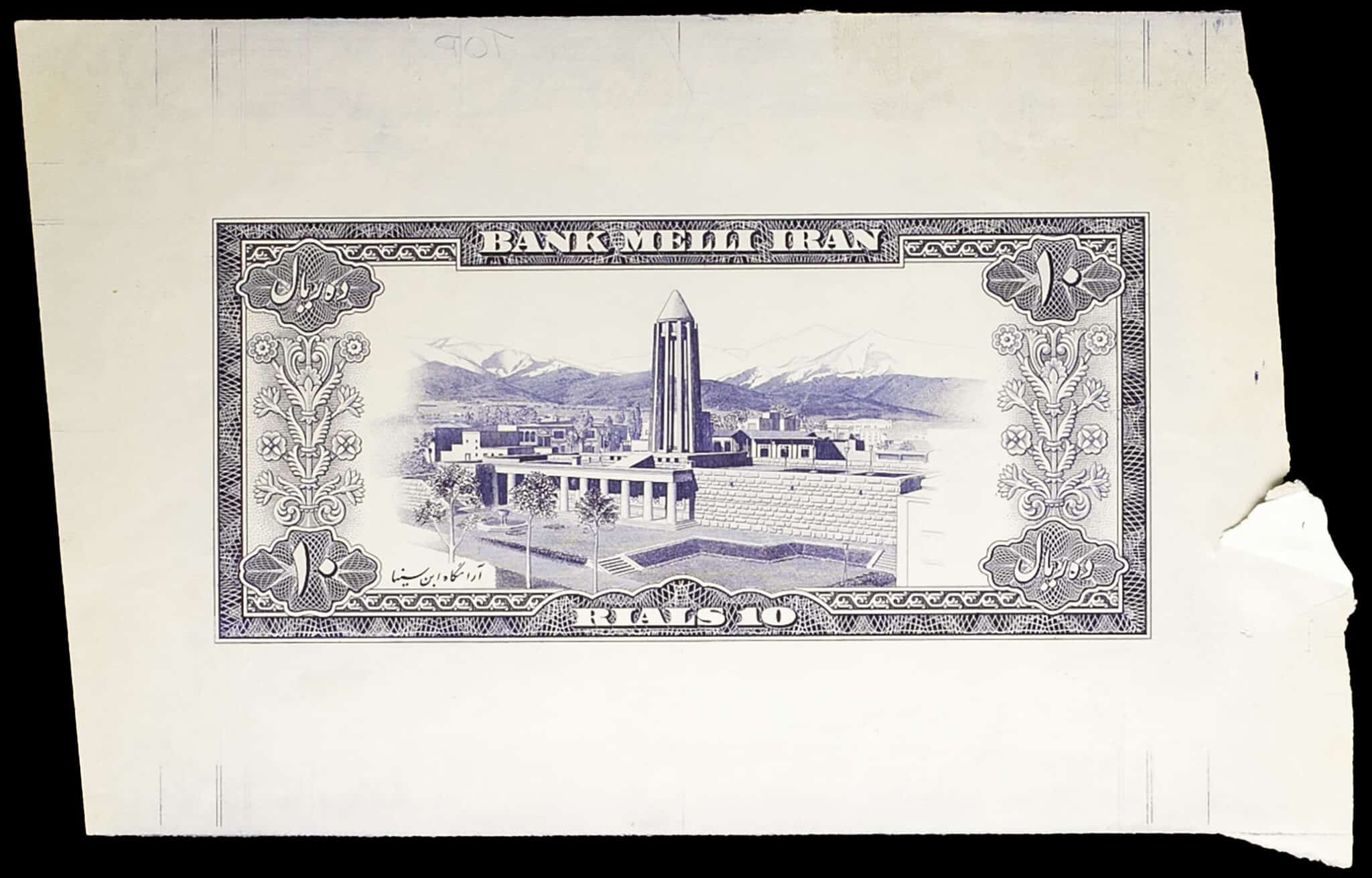 Épreuve et version adoptée du verso de 10 rials imprimée sur papier légèrement épais. Pedigree : provient de la collection Alan Dow.