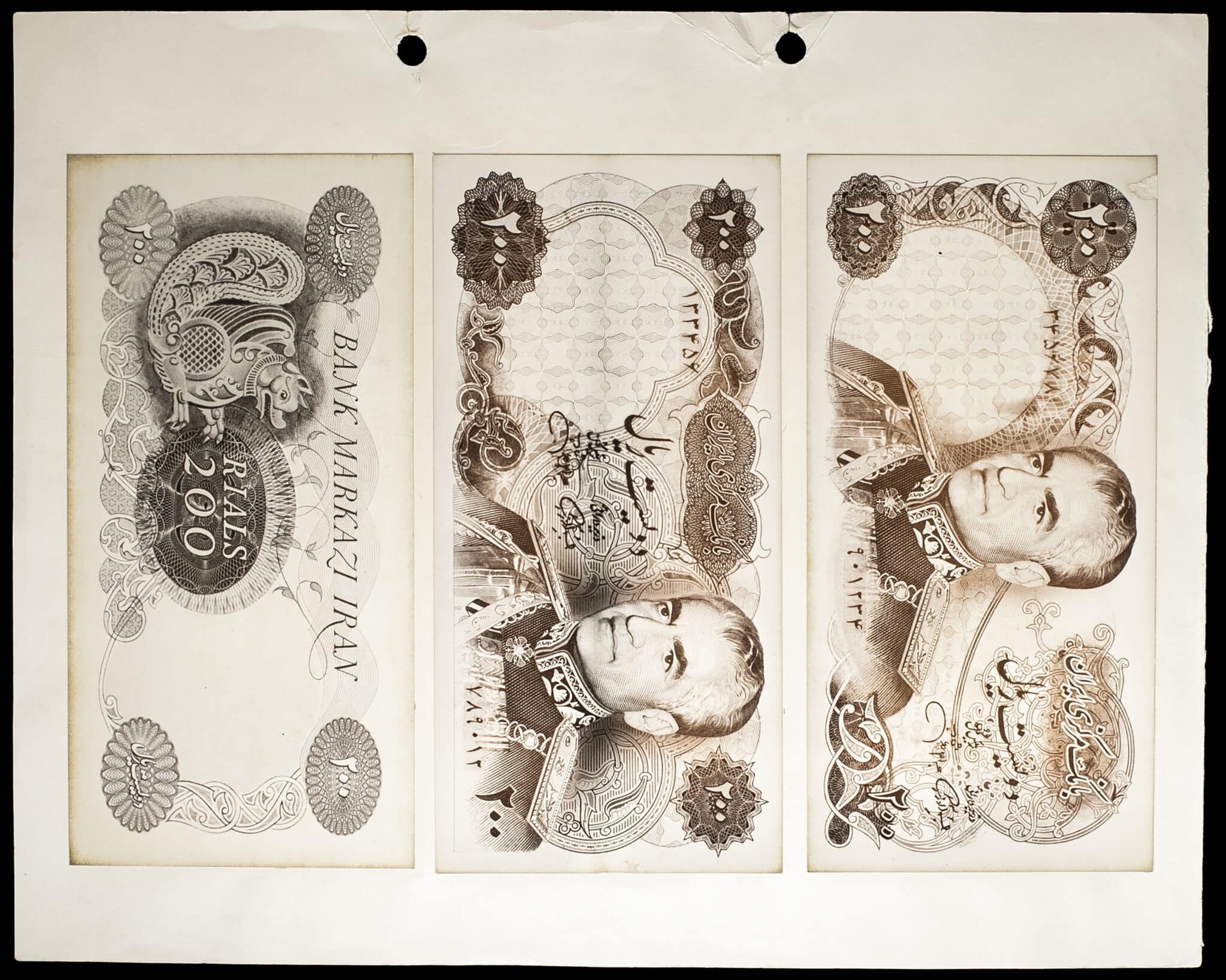 - Feuille de trois photographies d’épreuves du billet de 200 rials avec le portrait de Mohammad Reza Pahlavi ND (ca. 1970).