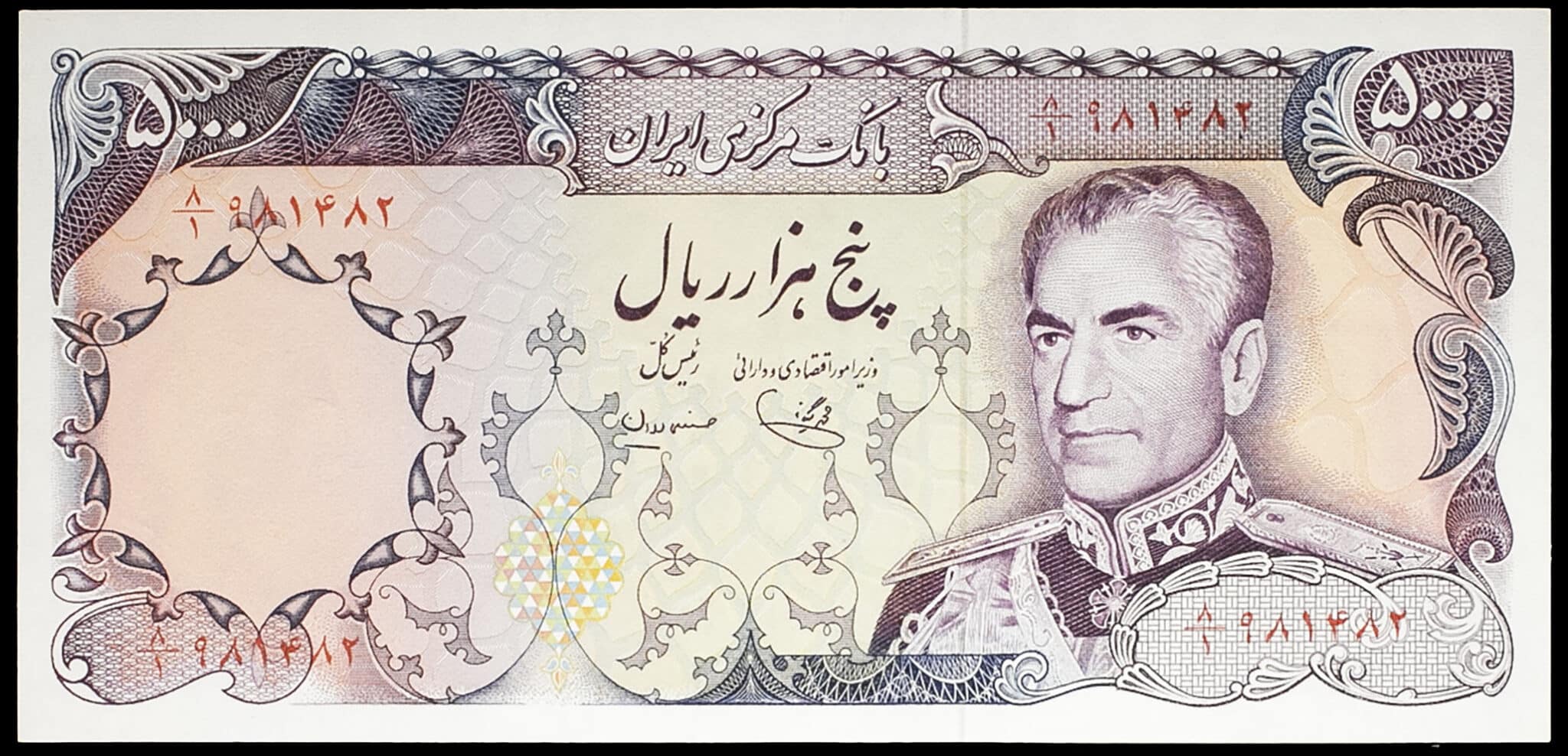- 5000 rials avec le portrait de Mohammad Reza Pahlavi ND (1974-1979).