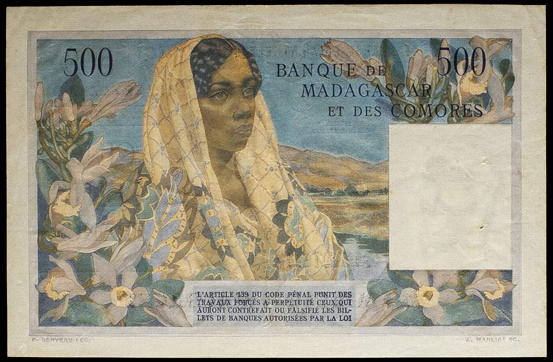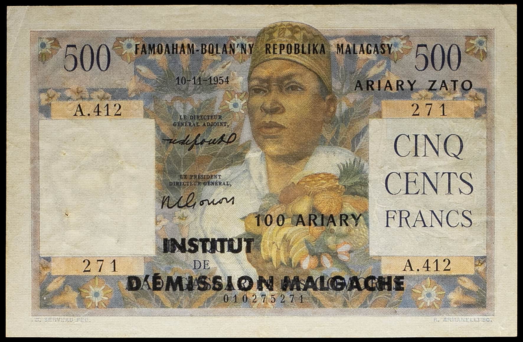 - 100 ariary surchargés sur 500 francs type “Comorien” - Institut d’Émission malgache 10-11-1954 (1961).