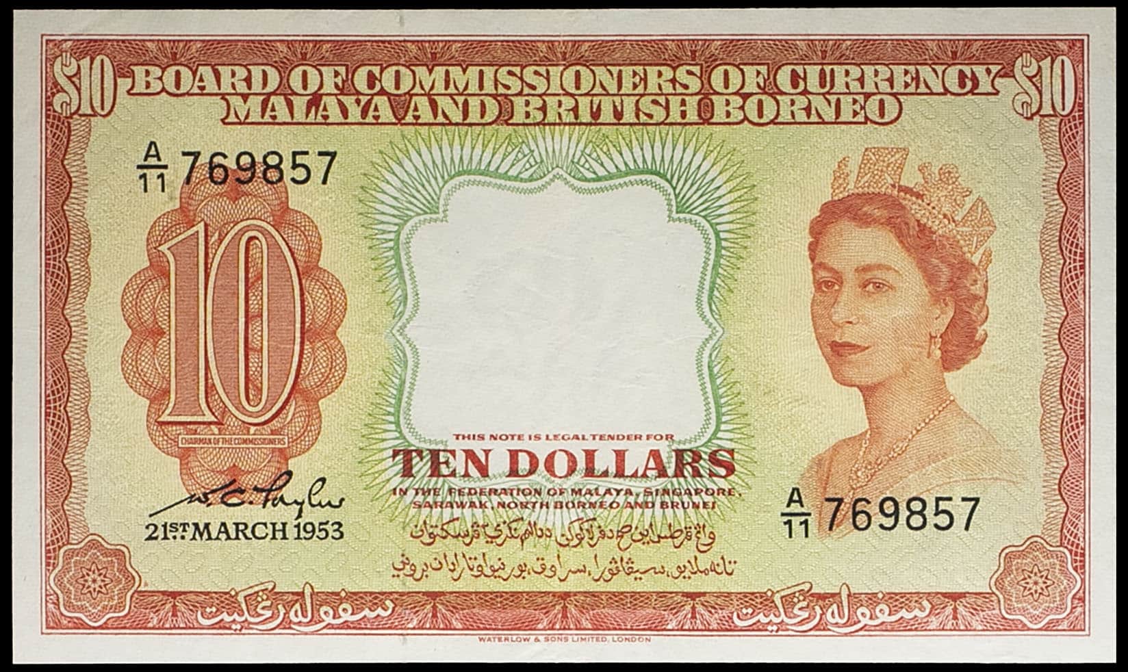 - MALAYSIA 10 dollars avec le portrait de la reine Élisabeth II 21 mars 1953.