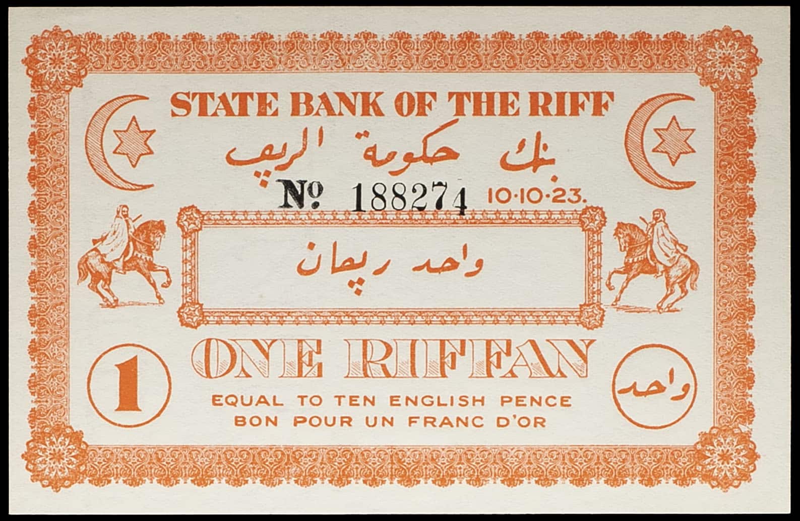 - MOROCCO 1 riffan - Banque d’État du Rif (State Bank of the Riff) 10.10.1923.