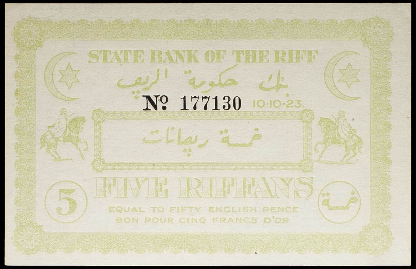 - MOROCCO 5 riffans - Banque d’État du Rif (State Bank of the Riff) 10.10.1923.