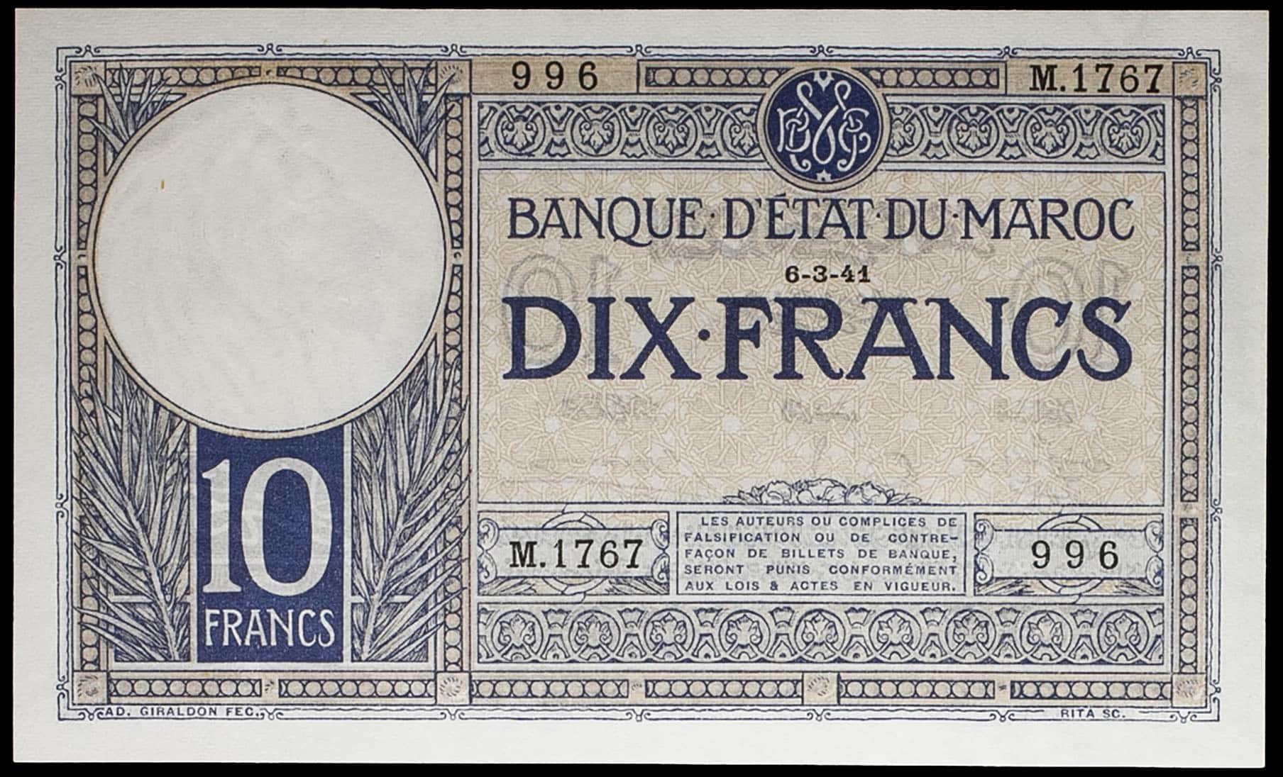 - MOROCCO 10 francs, type modifié 6-3-1941.