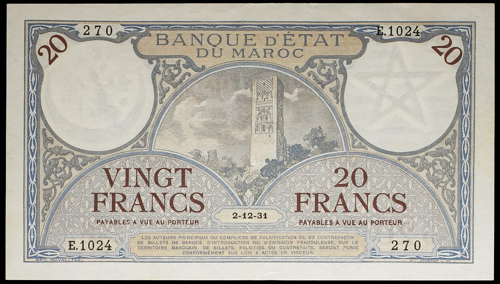 - MOROCCO 20 francs, type modifié 2-12-1931.