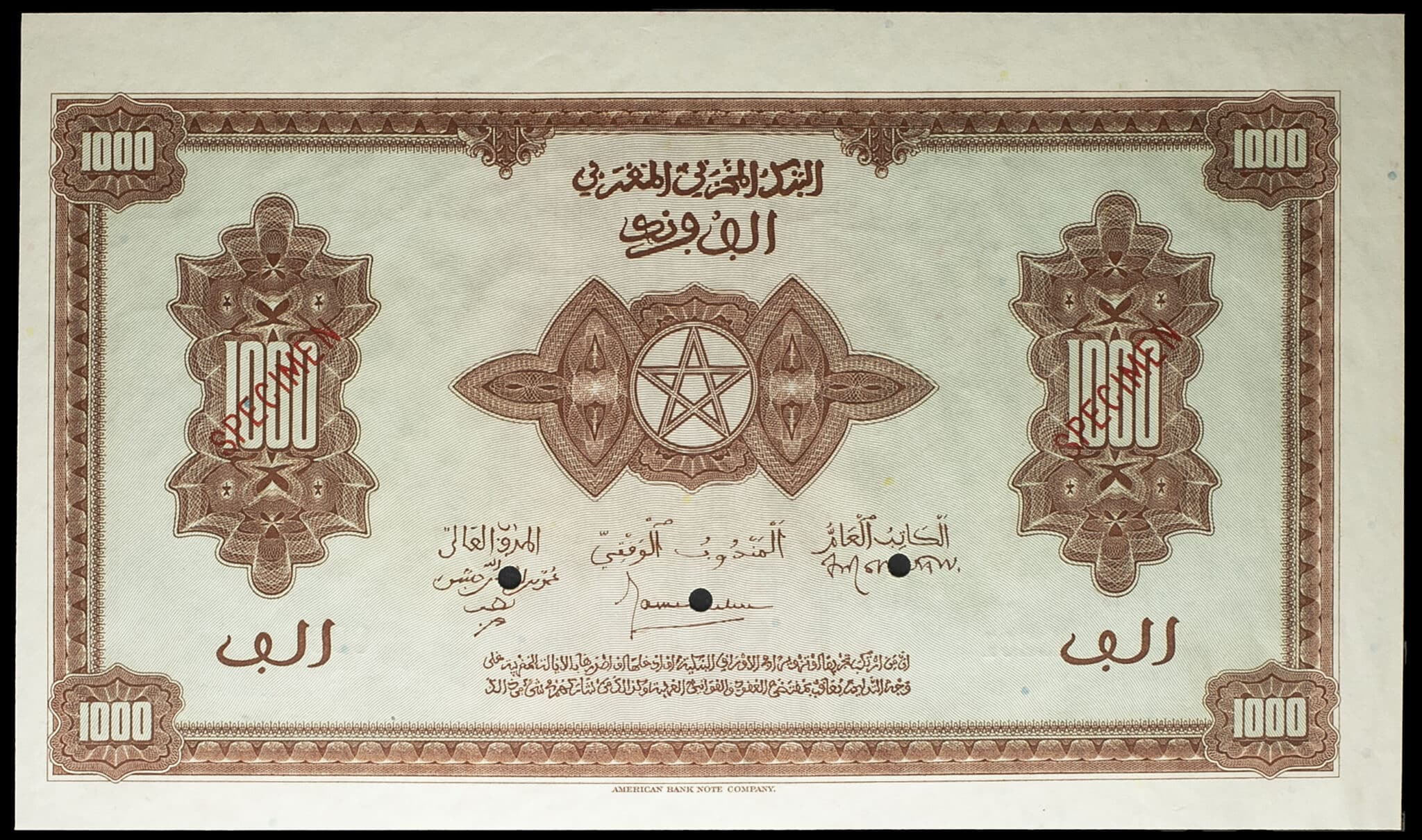 - MOROCCO 1000 francs, impression US (troisième émission) (SPÉCIMEN) 1-3-1944.