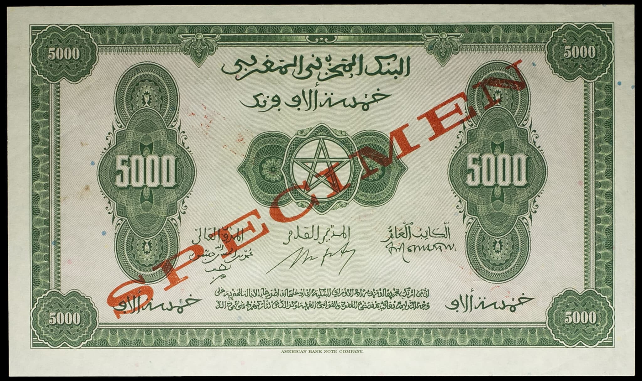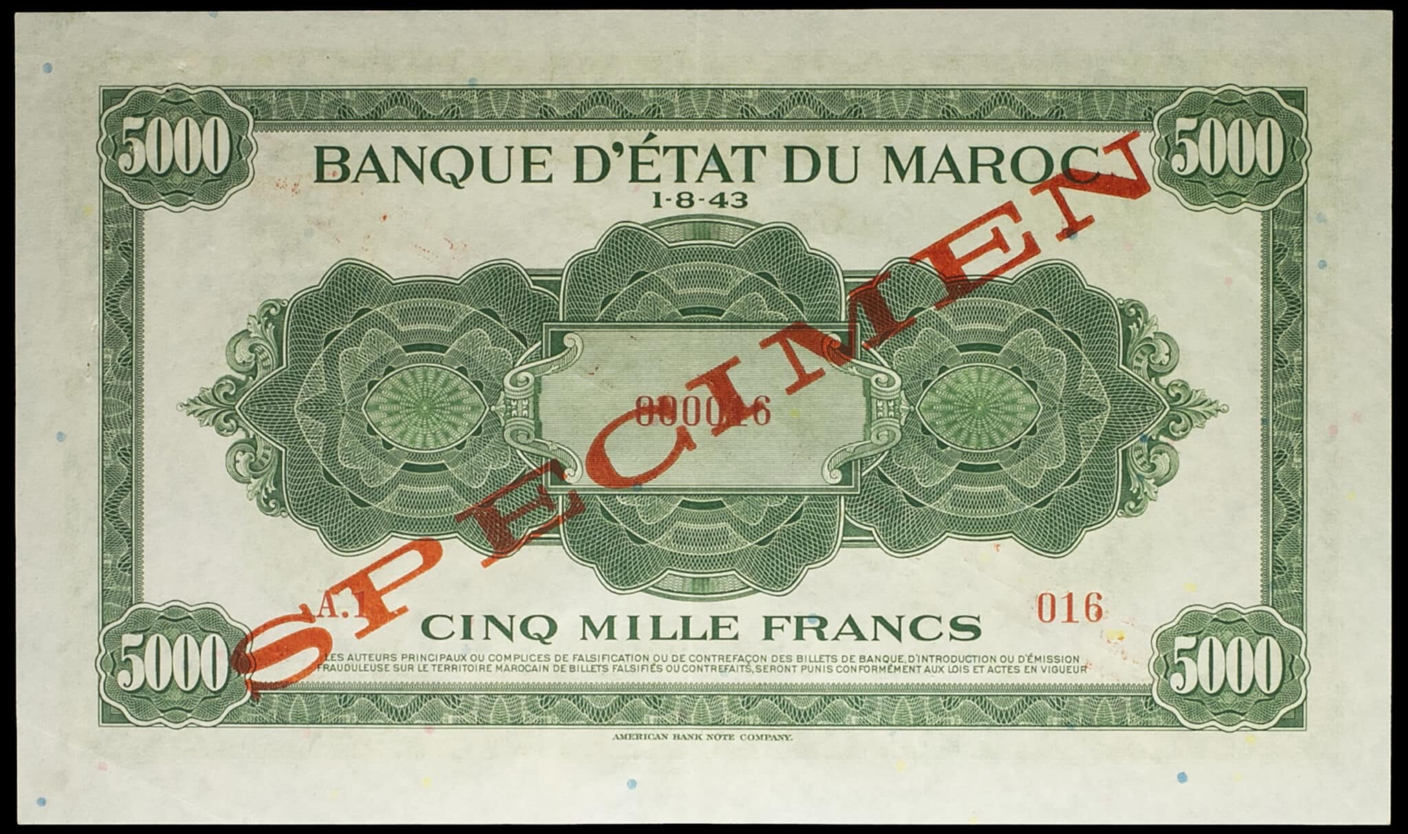 - MOROCCO 5000 francs, impression US (SPÉCIMEN) 1943.