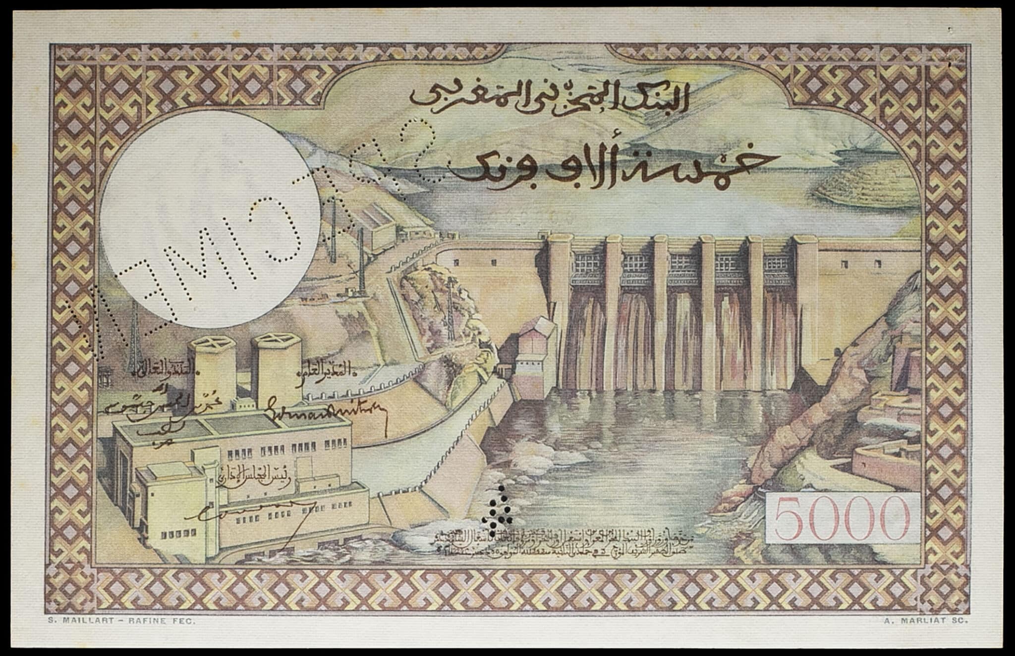 - MOROCCO 5000 francs type “vue de Fès” (SPÉCIMEN) ND (1953-58).