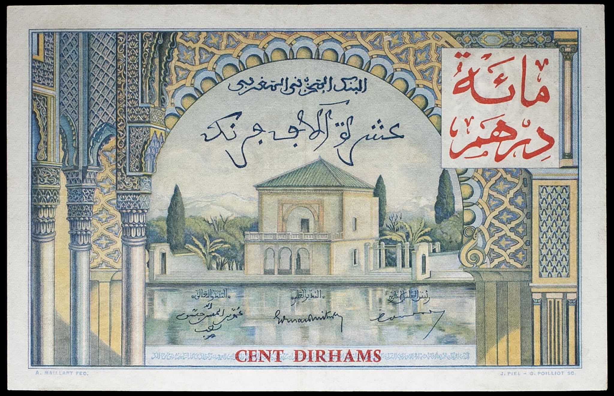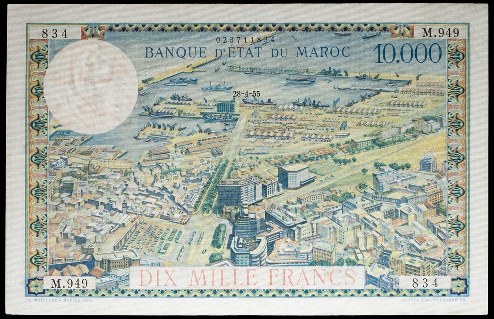- MOROCCO 100 dirhams surchargé sur 10 000 francs type “vue de Casablanca” 28-4-1955.
