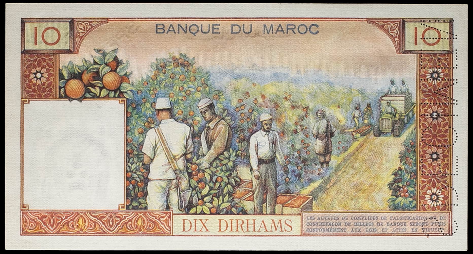- MOROCCO 10 dirhams avec le portrait du roi Mohammed V type “tour Hassan” (SPÉCIMEN) 1960.