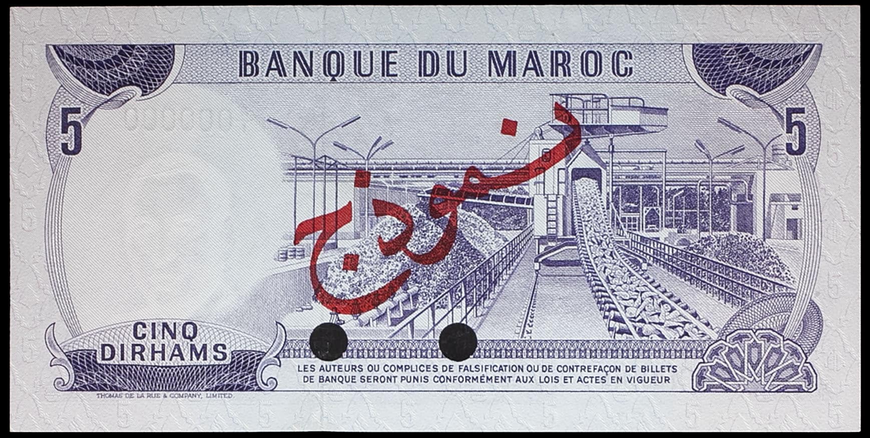 - MOROCCO 5 dirhams avec le portrait du roi Hassan II type “ksar d’Aït-ben-Haddou” (SPÉCIMEN) 1970 / AH 1390.