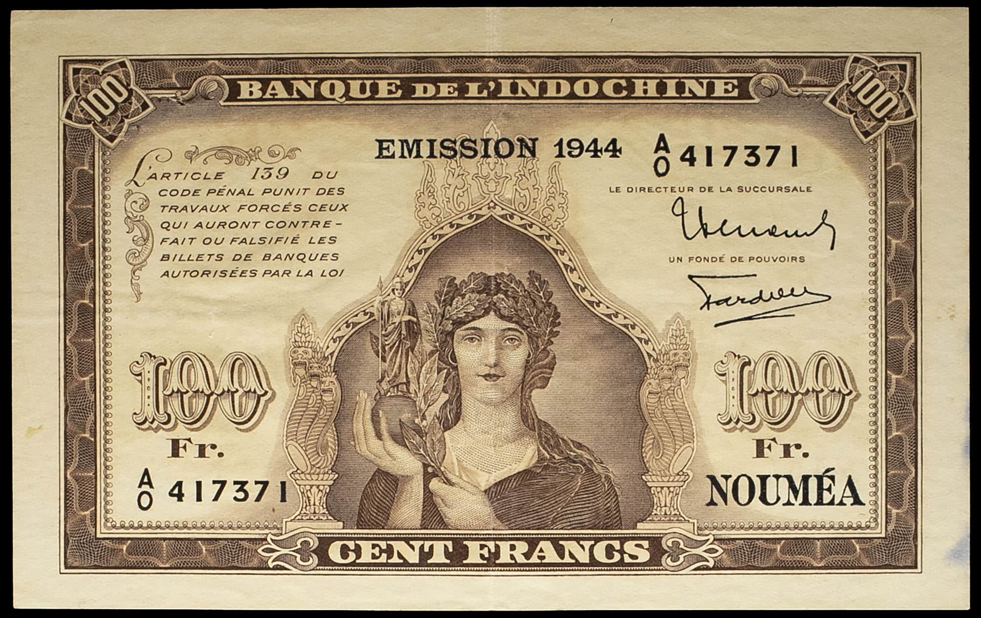 - NEW CALEDONIA 100 francs type “Minerve” - Banque de l’Indochine (émission australienne) 1944.