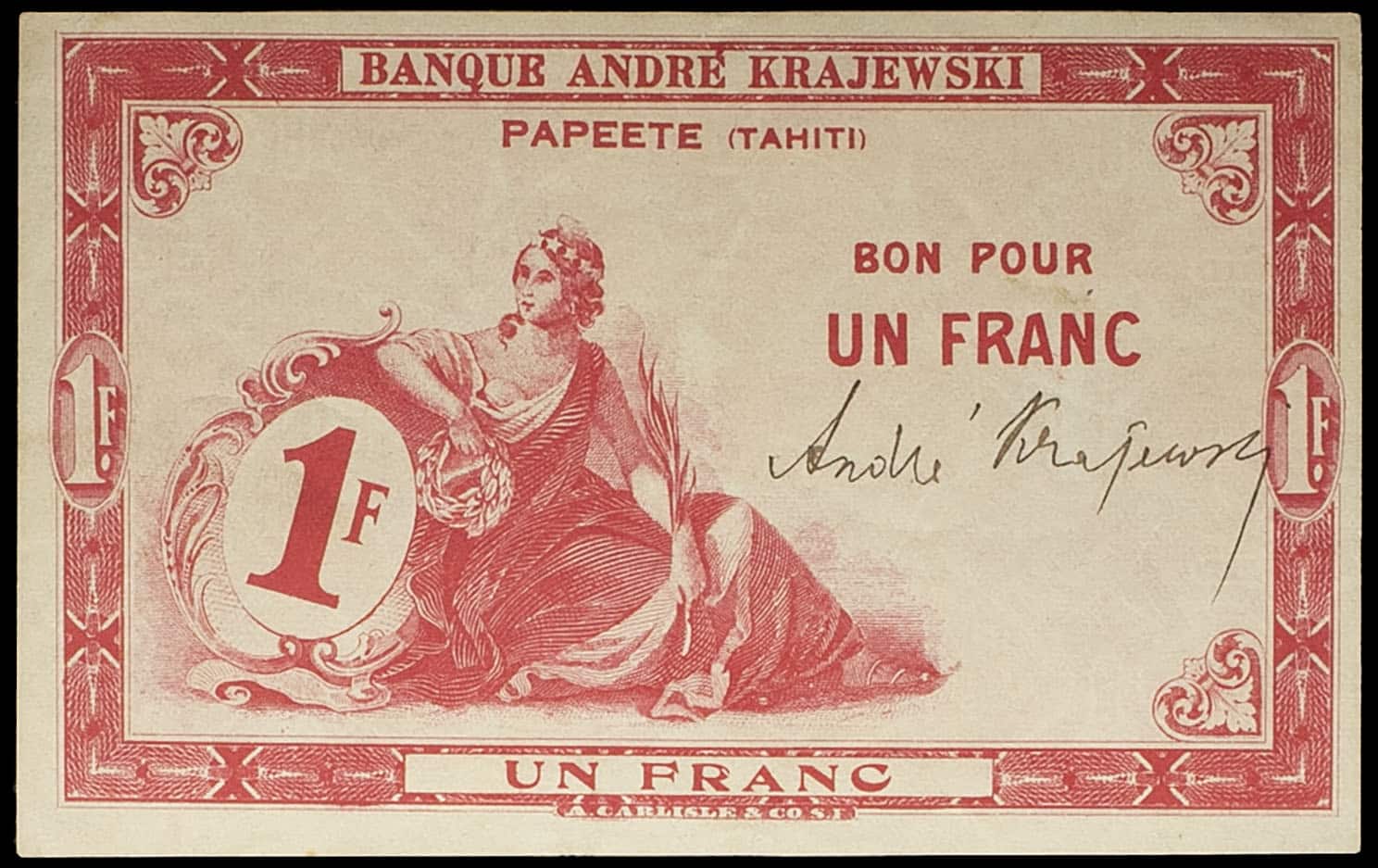 - FRENCH POLYNESIA / TAHITI Bon de 1 franc type “rouge” - Banque André Krajewski (signé) ND (1920).