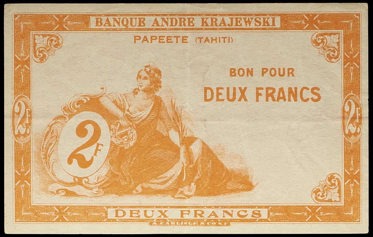 - FRENCH POLYNESIA / TAHITI Bon de 2 franc type “orange” - Banque André Krajewski ND (1920).