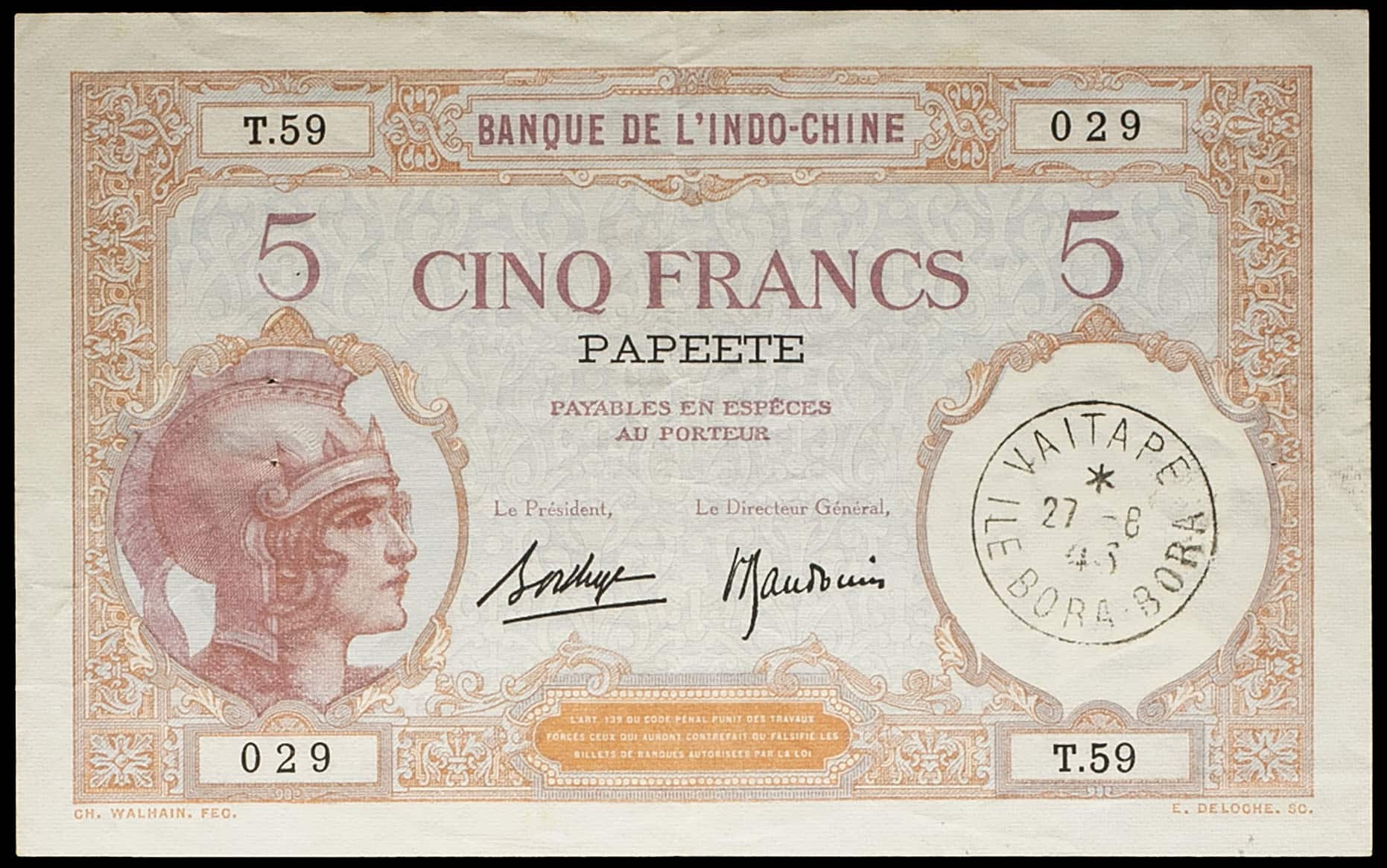 Alphabet T.59 - numéro 029. Signatures : Borduge / Baudouin. Type recherché avec ce tampon postal "VAITAPE / ILE DE BORA-BORA / 27-6-46” ! C'est la seconde fois que nous proposons un exemplaire à la vente !