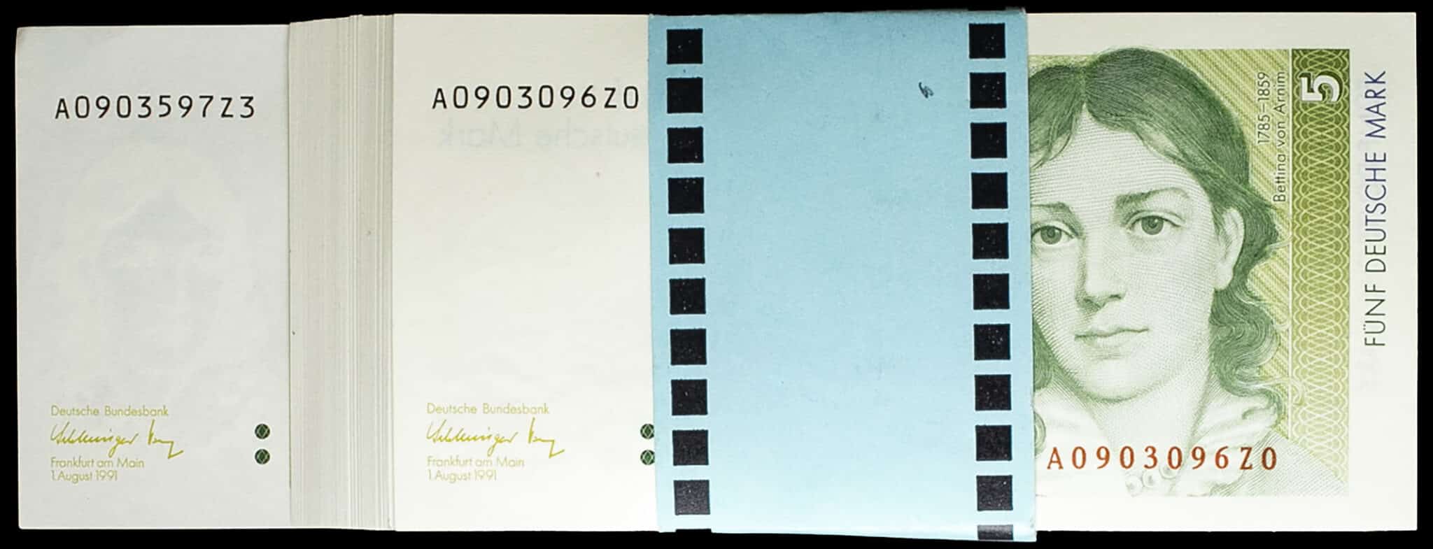 - GERMANY Lot (100) - liasse de 5 deutsche mark avec bandeau et numéros consécutifs 1er août 1991.