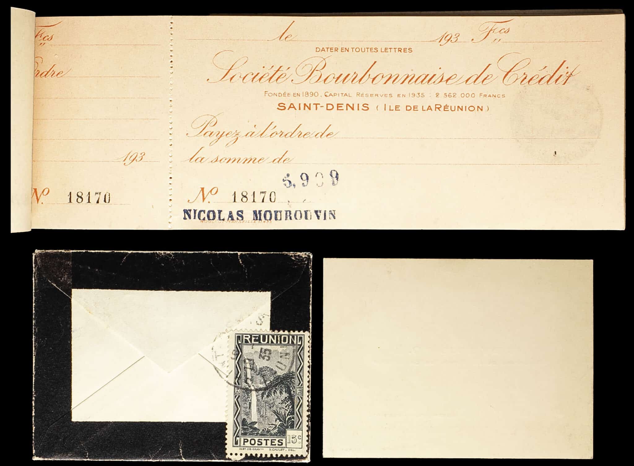 Intéressant document au nom de M. Nicolas Mourouvin et duquel un seul chèque a été utilisé. Nous joignons une carte de remerciement venant dans une petite enveloppe timbrée de M. Henry Poulet, directeur de la Banque de la Réunion dont on retrouve la signature sur les billets de 100 francs et 500 francs par exemple.