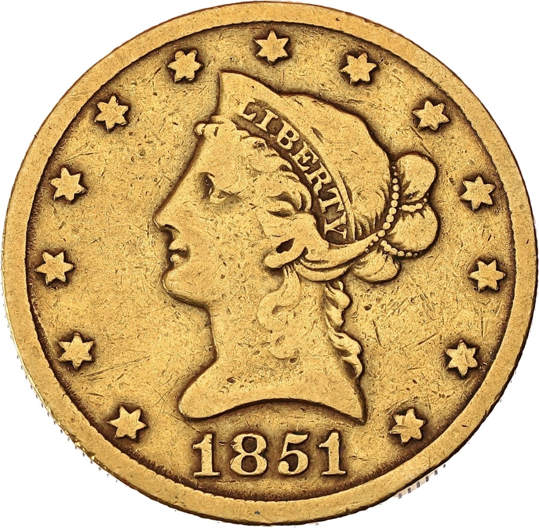 République fédérale des États-Unis d’Amérique (1776-à nos jours). 10 dollars Liberty, sans devise 1851, O, La Nouvelle-Orléans.