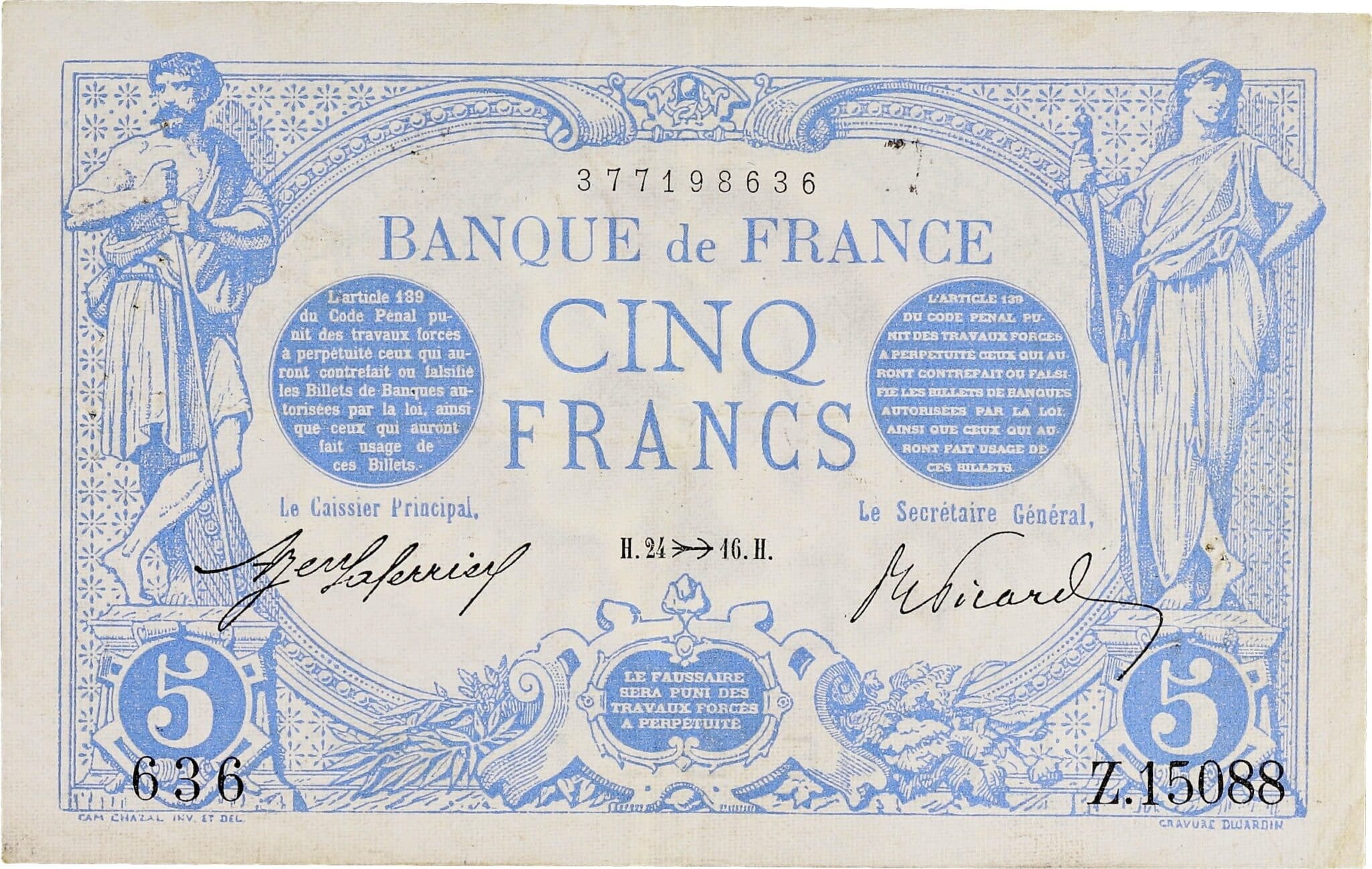 5 francs type 1905 “Bleu à tête filigranée” 24 novembre 1916.