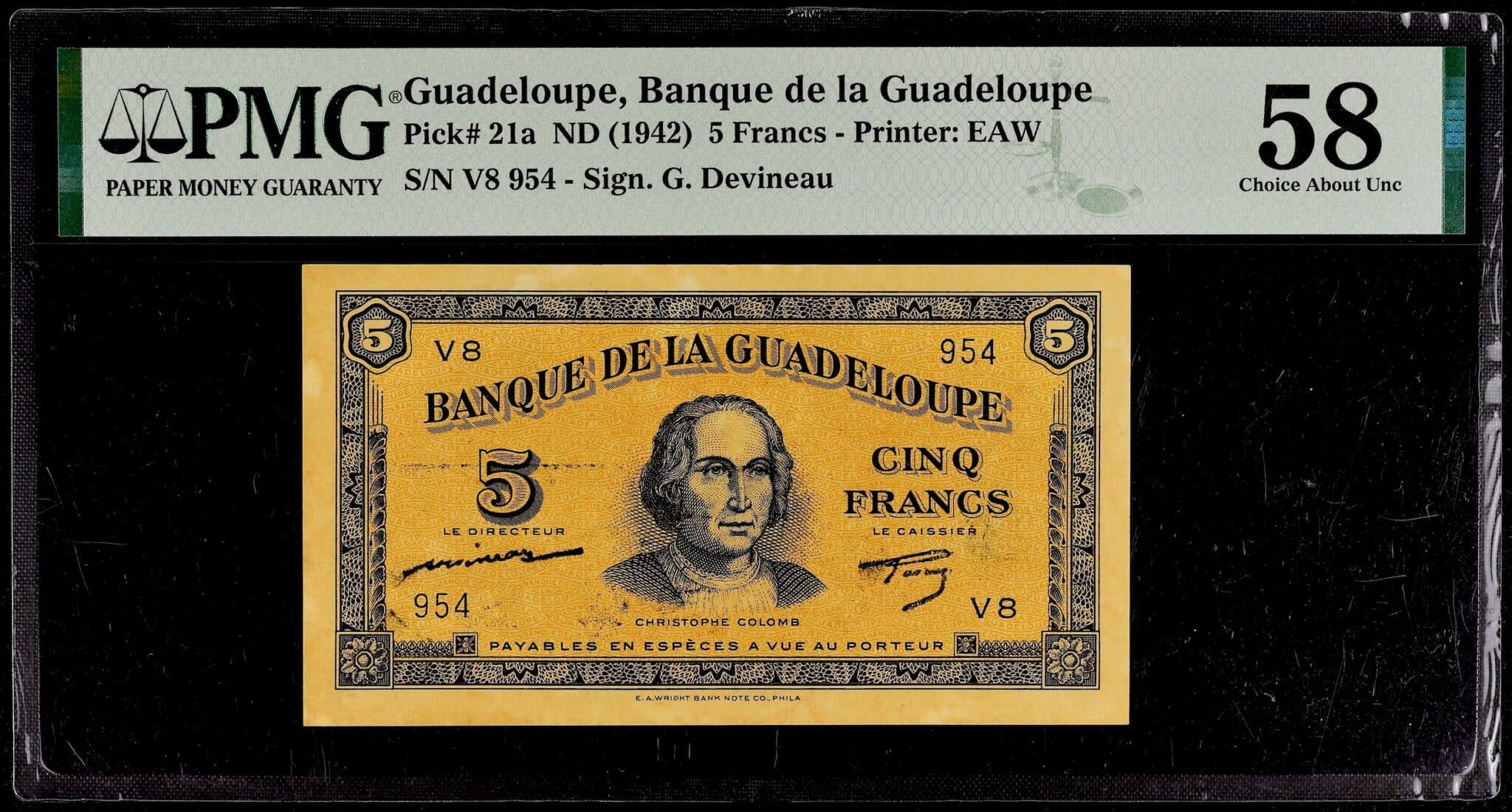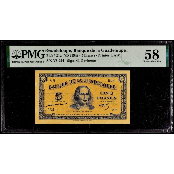C’est le second plus haut grade ! Alphabet V8 - numéro 954, c’est la première signature pour le type. Ce petit format du 5 francs est recherché dans les tous les états de conservation . A noter, seulement une dizaine d’exemplaires référencés dans la base de population PMG et surtout “Un” seul exemplaire en meilleur état en PMG 64 : Top pop).