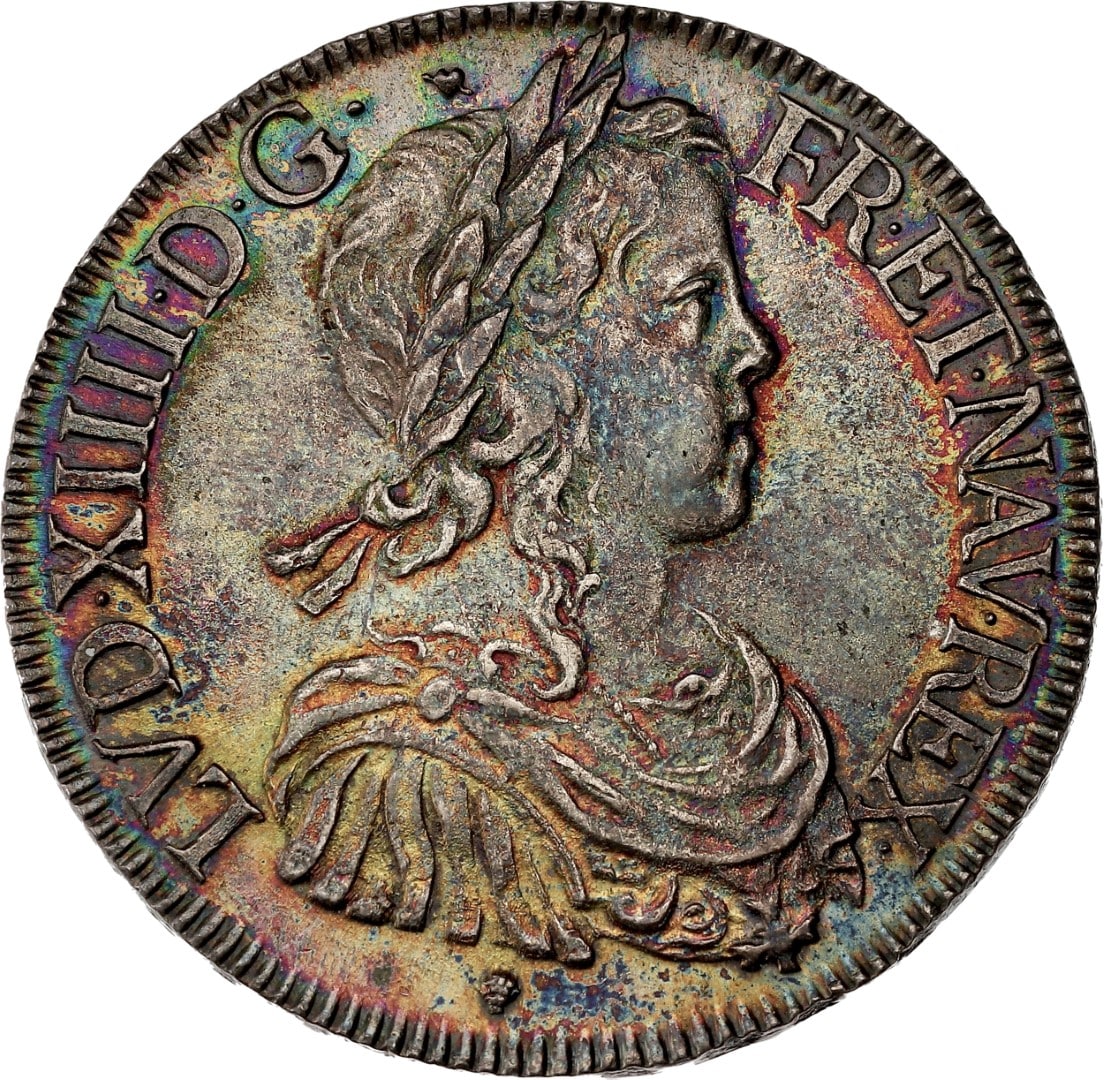 Av. LVD. XIIII. D. G. - FR. ET. NAV. REX. Buste enfantin du Roi à droite, lauré, drapé et cuirassé à l’antique, avec l’ordre du Saint-Esprit, une longue mèche descendant sur la cuirasse.
