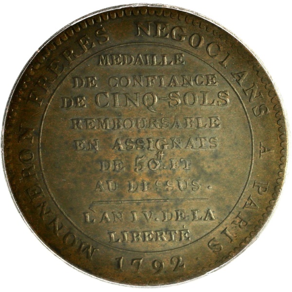 Rv. MONNERON FRERES NEGOCIANS A PARIS/ (date). Inscriptions en neuf lignes : MEDAILLE DE CONFIANCE DE CINQ-SOLS REMBOURSABLE EN ASSIGNATS DE 50#. ET AU DESSUS. L'AN IV. DE LA LIBERTÉ.