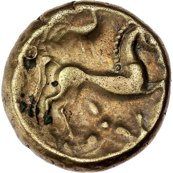 Rv. Cheval à droite, au pas ; une volute en crochet sort de sa bouche. Au-dessus, une grue à droite surmontée d’un annelet centré. Au-dessous, fleuron trilobé et centré d’un globule. derrière la croupe, annelet centré.