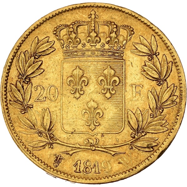 Louis XVIII (1814-1824). 20 francs tête nue 1819, W, Lille.