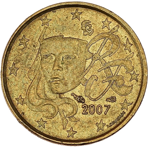 Ve République (1958 à nos jours). 1 centime d’Euro, frappée sur un flan de 5 francs CFA en laiton 2007, Pessac.