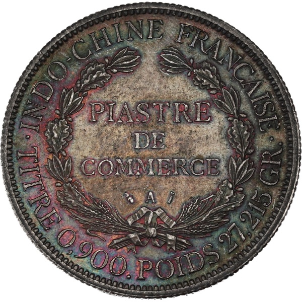 Rv. INDO-CHINE FRANÇAISE TITRE 0.900 POIDS 27,215 GR. Dans une couronne : PIASTRE DE COMMERCE (différents) (atelier).