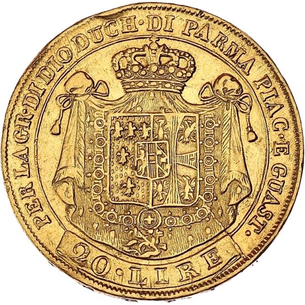 Rv. PER LA GR. DI DIO DUCH. DI PARMA PIAC. E GUAST./ 20 LIRE. Armes couronnées posées sur un manteau.