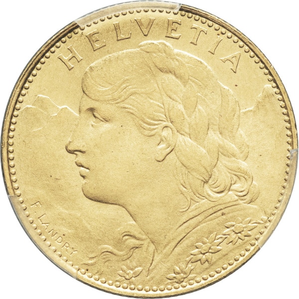 Av. HELVETIA. Buste d’Helvetia à gauche ; signature F. LANDRY.
