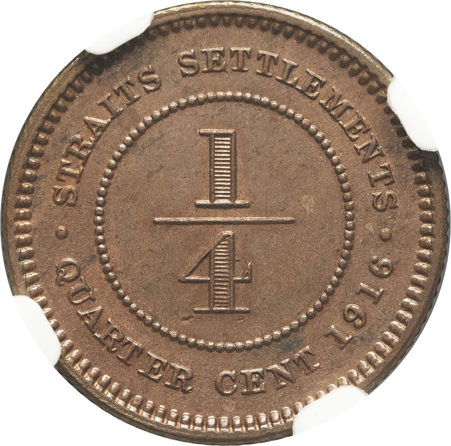 - STRAITS SETTLEMENTS (Penang, Singapore and Malacca) Georges V (1910-1936). 1/4 cent 1916, Londres.