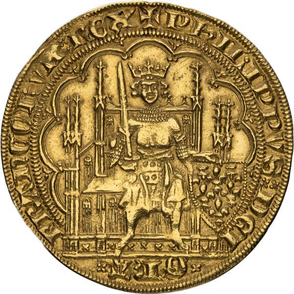 Av. + PHILIPPVSx DEIx - xGRAx - FRANCORVMx REX. Le Roi assis dans une stalle gothique, couronné, vêtu du haubert et de la cotte d’armes, tenant l’épée et l’écu de France aux lis sans nombre, dans un polylobe cantonné de petits trèfles ; sautoirs sur les marches de la stalle.