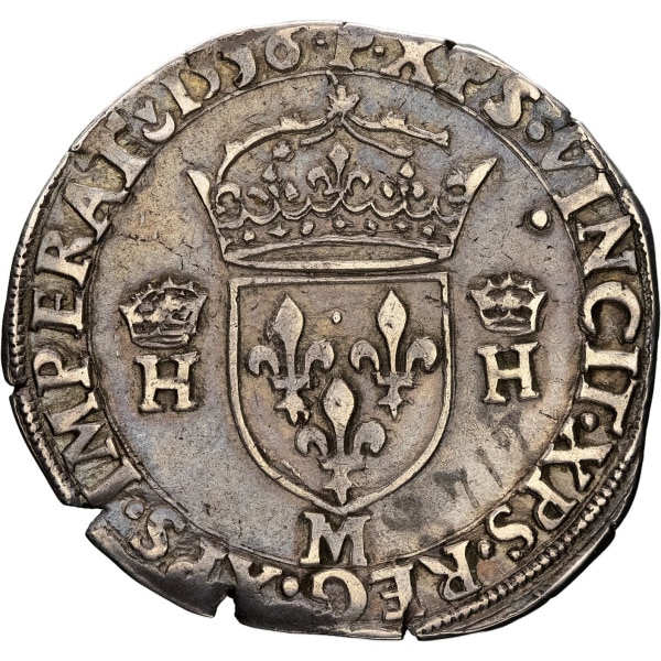 Rv. (différent). XPS. VINCIT. XPS. REG. XPS. IMPERAT. (date). Écu de France couronné, accosté de deux H couronnées, (atelier) sous l’écu.
