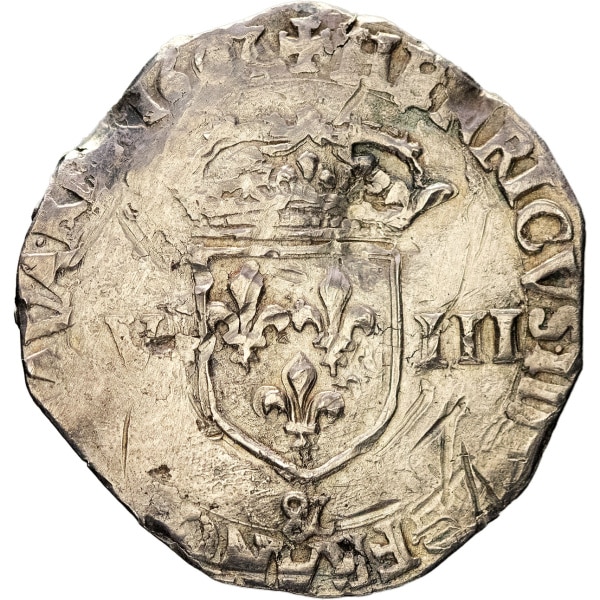 Av. (à 6 h) HENRICVS. IIII. D. G. FRANC. ET. NAVA. REX. Écu de France couronné, accosté de V - III ; au-dessous (atelier).