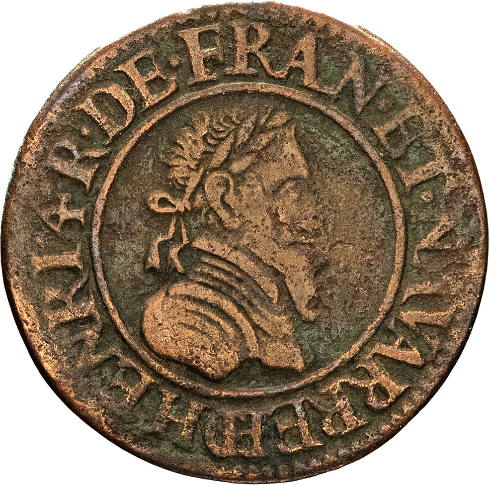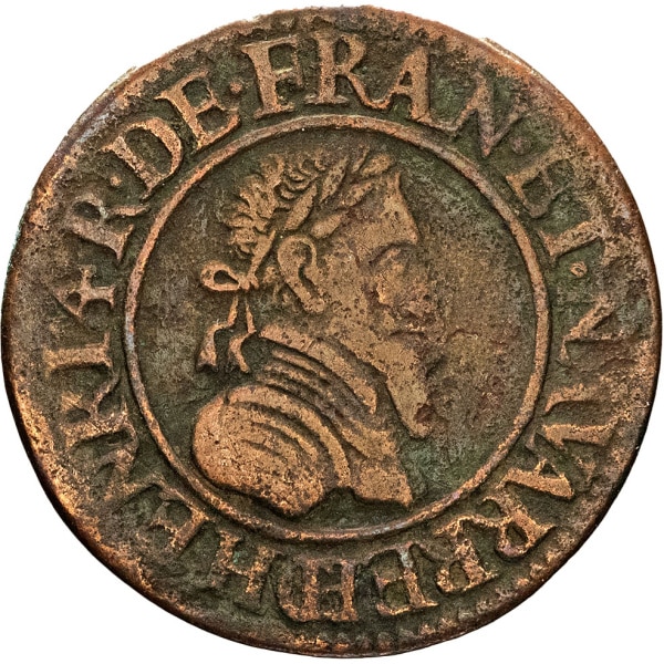 Av. HENRI: 4: R. DE. FRAN. ET. NAVARRE. Buste lauré et cuirassé à droite ; à l’exergue, (atelier).