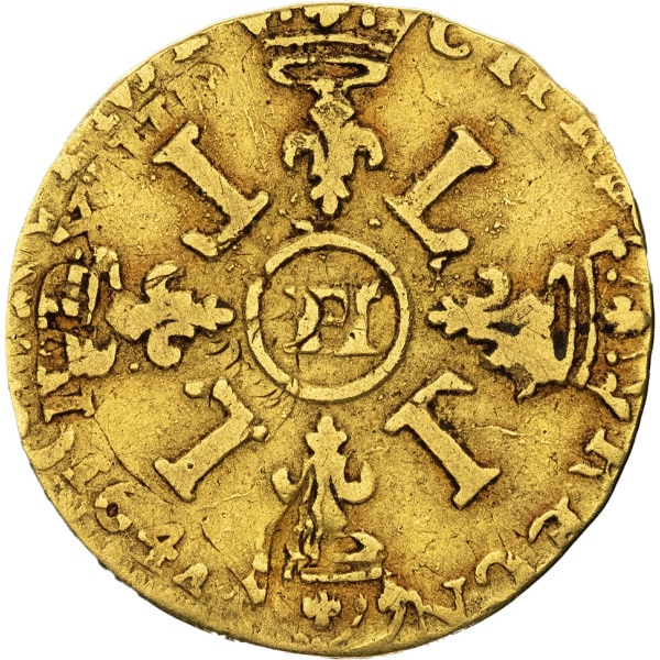 Rv. CHRS. REGN. VINC. IMP (différent). Croix formée de quatre lis couronnés, cantonnée de quatre L, (atelier) dans un cercle en cœur.
