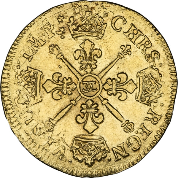 Rv. CHRS. REGN. VINC. IMP (différent). Croix formée de quatre lis couronnés, avec (atelier) dans un cercle en cœur, brochant sur une main de justice et un sceptre posés en sautoir.