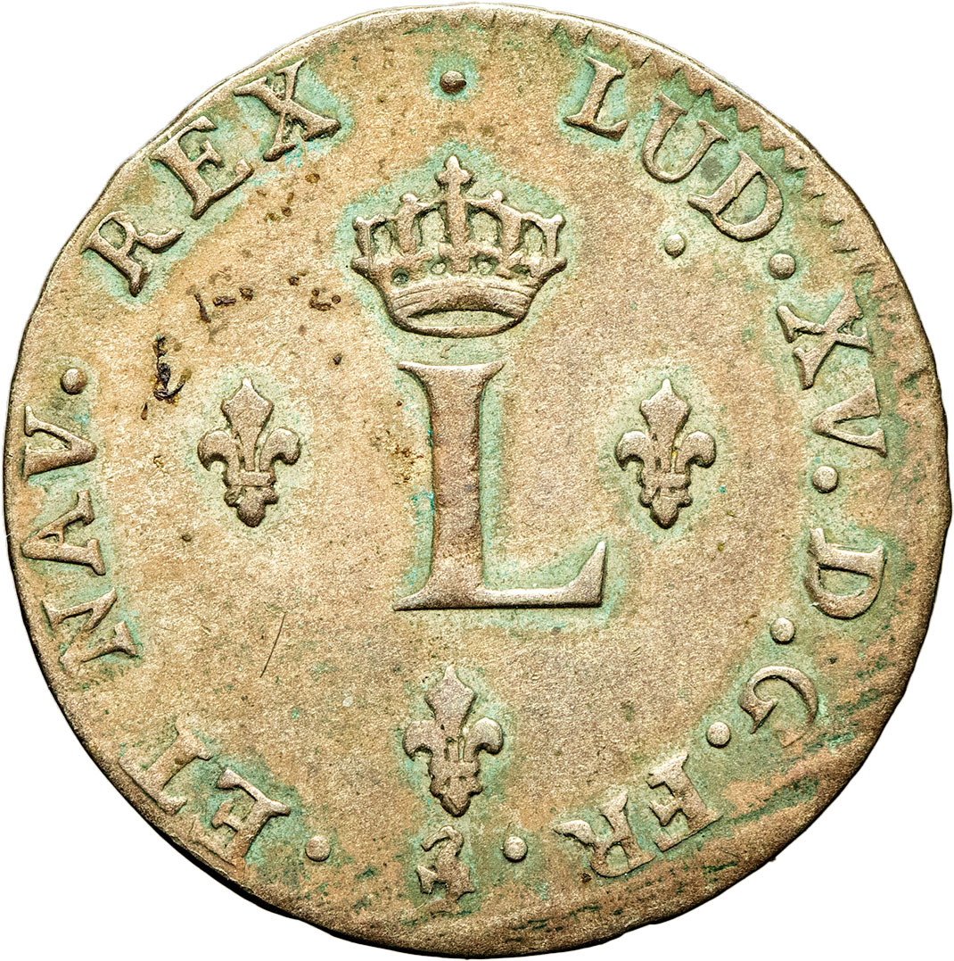 Av. .LUD. XV. D. G. FR. (différent) ET. NAV. REX. Dans le champ, L couronnée entre trois lis posés 2 et 1.