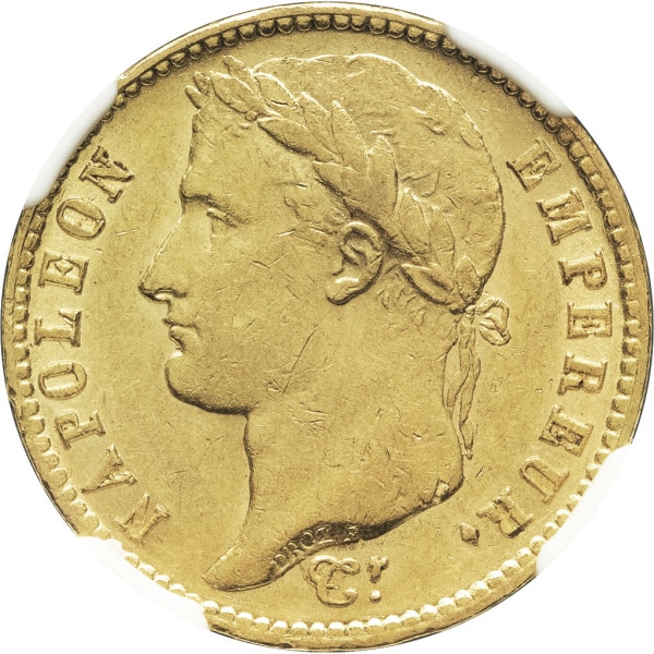 Av. NAPOLEON EMPEREUR. Tête laurée à gauche, signature DROZ F. et au-dessous Tr cursif.