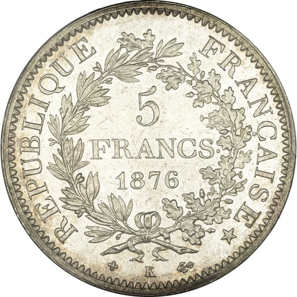 - IIIe République (1870-1940). 5 francs Hercule 1876, K, Bordeaux.