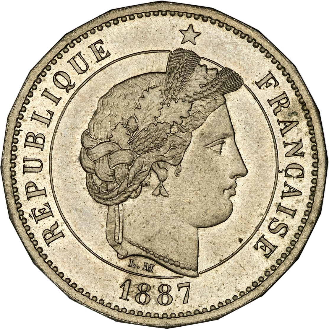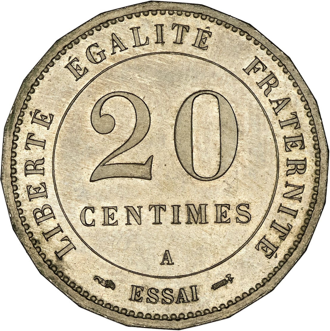 IIIe République (1870-1940). Essai de 20 centimes Merley, 2e type, sans faisceau ni rameau, flan à 20 pans 1887, A, Paris.