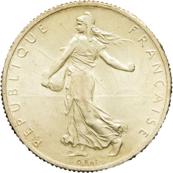 Av. REPUBLIQUE FRANÇAISE. La Semeuse à gauche, avec le soleil levant, marchant et semant à contre-vent ; signature O. ROTY.