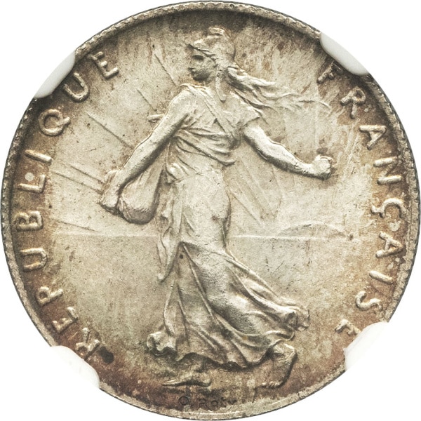 Av. REPUBLIQUE FRANÇAISE. La Semeuse à gauche, avec le soleil levant, marchant et semant à contre-vent ; signature O. ROTY.
